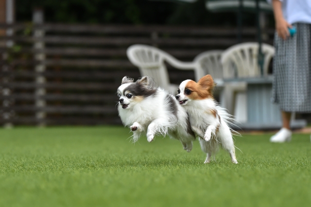 広々とした芝生のドッグランで愛犬がのびのび遊べる環境。リードを外して自由に駆け回る姿に、こちらまで癒されます。